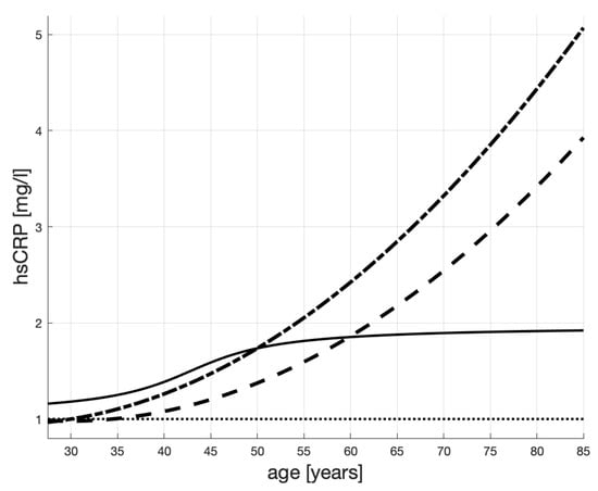 - a male patient is in an increased-risk group (hsCRP > 1 mg/L) since young and his healthiness worsens after he turns 30; however, then, because of lifestyle changes, or treatment, his hsCRP stabilizes when he is about 45—see the solid line.