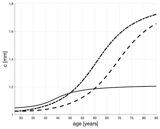 Maximum IMT levels, c, as transformed hsCRP scenarios proposed in Figure 3. The dashed line represents a healthy male until his mid-thirties when the levels of hsCRP start growing slowly; the dash-dotted line—a healthy male until his mid-thirties when the levels of hsCRP start growing rapidly; the solid line—a male representing an increased-risk group (hsCRP > 1 mg/L) since young and his healthiness worsens after he turns 30; however, then, due to the proper conduct, his hsCRP stabilizes when he is about 45.