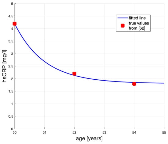 where y is the measured hsCRP in mg/ℓ; T is the age at which the patient begins receiving statin, is his hsCRP score at T. Then, and so is the number of years after T; is a calibrated parameter. Calibrating , to fit model (4) to data from [48], and assuming the male patient’s age is and his hsCRP is mg/L, yields the hsCRP time profile shown in Figure 6. Here, the large dots represent the measurements reported in [48].