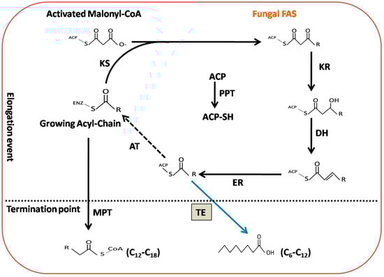 Medium-chain fatty acids (MCFAs) and their derivates with a chain length of 8 to 12 [] are involved in the production of green fuels. These MCFAs also offer vital roles as promising intermediates for diverse biochemical industries, such as the production of detergents, bio-plasticizers, surfactants, perfumes, adhesives, and substrates for flavor and fragrance [,,,,,,]. Over the previous decade, these MCFAs have gained attention as part of a healthy diet because they are absorbed and transported directly into the liver via portal veins and rapidly metabolized by the β-oxidation pathway, eventually augmenting diet-induced thermo-genesis. This process offers a platform for the prevention/treatment of diverse metabolic disorders, including atherosclerosis, hypertension, hyperlipidemia, obesity, type-II diabetes, and cardiovascular diseases []. The concentration of naturally produced MCFA from botanical sources has been found to be insufficient to fulfill industrial demand [,]. Therefore, the current research focus has shifted towards the de novo biosynthesis of MCFAs from different oleaginous microorganisms [,,,,,,,,]. These microorganisms represent a reliable option for the production of fatty-acid-derived products on an industrial scale [,,,,].