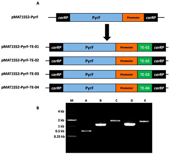 (A,B) Expression of TE-01, TE-02, TE-03, and TE-04 genes. (A) Structure of plasmids pMAT1552-pyrF-TE-01, pMAT1552-pyrF-TE-02, pMAT1552-pyrF-TE-03, pMAT1552-pyrF-TE-04 for TE-01, TE-02, TE-03, TE-04 genes over-expressing in M. circinelloides M65 are demonstrated. Green boxes indicate the coding region of thioesterase genes. (B) Polymerase chain reaction (PCR) amplification of genome of control strain (A) and thioesterase gene (TE) over-expressing strains i.e., M65-TE-01, M65-TE-02, M65-TE-03, and M65-TE-04 was demonstrated to as B–E, respectively with the primers (Supplementary materials: Table S2). M, Gene Ruler DNA Ladder Mix. Sizes in kb of the relevant maker fragments are indicated.