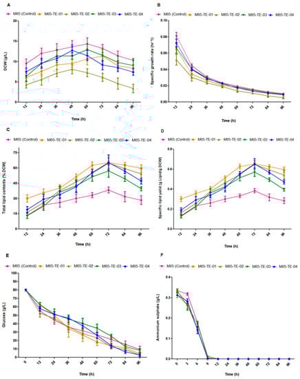 Cell growth, total lipid contents, and the specific lipid yield in all engineered strains (i.e., M65-TE-01, M65-TE-02, M65-TE-03, and M65-TE-04) were compared with the control strain (M65) over 96 h of cultivation in a 3-L fermenter (Figure 3). The growth of all TE-over-expressing strains were inhibited, especially for the M65-TE-02 strain (<50%) from initial to the later growth stage as shown in Figure 3A,B. The dry cell weight (DCW) of all TE over-expressing strains were varies and lower than control from the initial cultivation stage (12 h), indicating the gene expression was effected from the start of the cultivation. In addition, TE over-expression also caused profound shift on the growth stages as most of the engineered strains has a shorter stationary stage except for M65-TE-01, and growth decreased after 72 h of cultivation (Figure 3A,B). This condition might be due to most of the metabolic flux of the TE over-expressing strains were directed to lipid production as the lipid produced by these strain were significantly higher than control (Figure 3A–D). All the engineered strains showed a significant elevation of lipid accumulation ranging from 57 ± 4% to 65 ± 3% whereas the control strain demonstrated a lipid accumulation of approximately 36±2% (Figure 3C). In addition to TLC, the engineered strains, i.e., M65-TE-01, M65-TE-02, M65-TE-03, and M65-TE-04, produced 0.65 ± 0.015, 0.64 ± 0.052, 0.57 ± 0.061, and 0.65 ± 0.074 g lipid per gram DCW, respectively. The control strain (M65) was only able to accumulate 0.36±0.29 g lipid per gram dry cell weight, demonstrating that the improved specific lipid productivity was due to reduced growth of engineered strains leading to enhance de novo fatty acids synthesis (Figure 3D). The pattern of glucose and nitrogen consumption remained almost similar, but comparatively rapid glucose consumption was noticed for strain M65-TE-04 (Figure 3E,F).