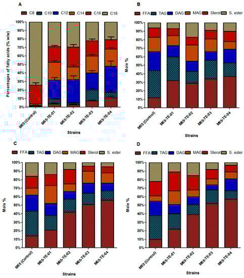 An inverse correlation was observed between the proportions of TAGs and free fatty acids (FFAs); likewise, the control strain contained a greater share of the TAG fraction (i.e., 32%) compared with the total lipid content in comparison to the engineered strains (i.e., 28%, 14%, 22%, and 16% for M65-TE-01, M65-TE-02, M65-TE-03, and M65-TE-04, respectively). Conversely, a greater abundance of FFAs was detected in all engineered strains, i.e., 32%, 29%, 34%, and 37% for M65-TE-01, M65-TE-02, M65-TE-03, and M65-TE-04, respectively) in comparison to the control strain (0.65%). Interestingly, these de novo MCFAs were found to integrate into all lipid classes. All fractions of total lipids for the engineered strains are depicted in Figure 4B. Our result showed that all engineered strains contained significant quantities of MCFAs in the TAG and FFA fractions (Figure 4B).