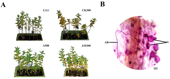 Growth of E. angustifolia inoculated AMF (arbuscular mycorrhizal fungi) under salt stress and a representative image of AMF colonization. Note: (A) represents the growth contrast in mycorrhizal and non-mycorrhizal E. angustifolia after salt stress. (B) represents a photomicrograph of the structural colonization of AMF in the root of R. irregularis. AM, mycorrhizal; CK, non-mycorrhizal; 0 mmol/L, without salt stress; 300 mmol/L, during salt stress; AR: Arbuscule; V: Vesicles. Scar bar: 20 μm.