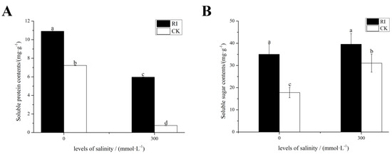 Effects of RI and CK on the soluble sugar content and soluble protein content in the leaves of E. angustifolia under salt stress. Note: (A) soluble protein, (B) soluble sugar. RI, mycorrhizal; CK, non-mycorrhizal; 0 mmol/L, without salt stress; 300 mmol/L, during salt stress. Columns represent the means for three replicates (n = 3). Error bars show the standard error. Columns with different letters indicate significant differences between the treatments at p < 0.05.