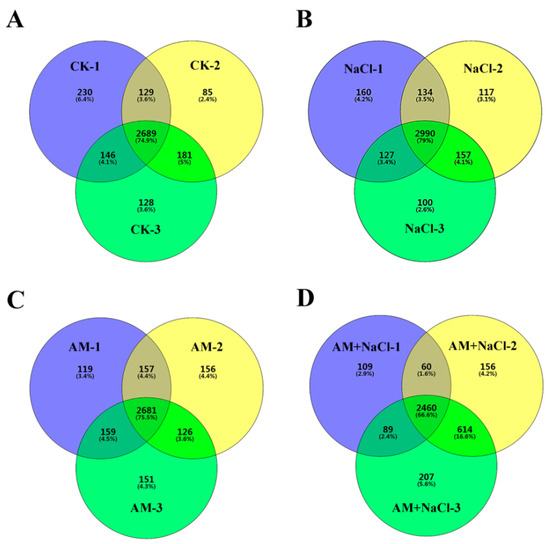 Statistics of the number of proteins identified in each treatment group. Note: (A) the number of proteins identified in the three replicates of CK group; (B) the number of proteins identified in the three replicates of NaCl group; (C) the number of proteins identified in the three replicates of AM group; (D) the number of proteins identified in the three replicates of AM + NaCl group.
