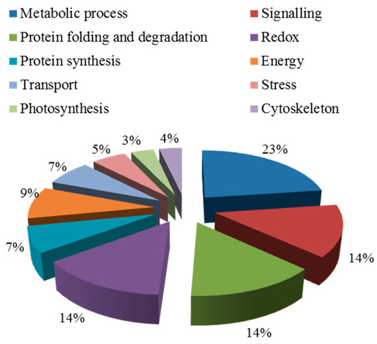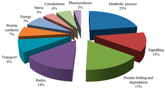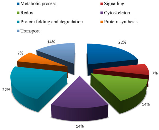 Blast2GO (Version 3.3.5) was used to annotate the biological functions of the targeted proteins. These proteins were divided into seven groups (Figure 4), including metabolism, signal transduction, redox, transport, cytoskeleton, protein synthesis, protein folding, and degradation (Table A1). Among them, the proportion of metabolic and protein folding related proteins were the largest, which was 22%. The second category was related to redox, transport, and cytoskeleton, which was 14%. The third category included signal transduction-related and protein synthesis proteins.