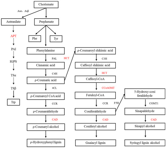 - In this study, we found a chorismate mutase (CM), which catalyzes the conversion of branched acid to prebenzoic acid. Prebenzoic acid can produce phenolic compounds through the phenylpropane metabolic pathway, including phenylalanine (Phe), tyrosine (Tyr), anthocyanin, and tannin [20,21]. Phenylpropane metabolism is indirectly generated by the shikimic acid pathway. This pathway might play an important role in plant stress defense. We found three proteins that relate to the phenylalanine metabolic pathways, including shikimate O-hydroxycinnamoyltransferase, cinnamyl alcohol dehydrogenase, and caffeoyl-CoA O-methyltransferase. Flavonoids are synthesized by the condensation of phenylpropane derivatives with malonate monoacyl coenzyme A. In addition, shikimic acid O-hydroxyacinnamate transferase and caffeoyl coenzyme A-O-methyltransferase were also involved.
