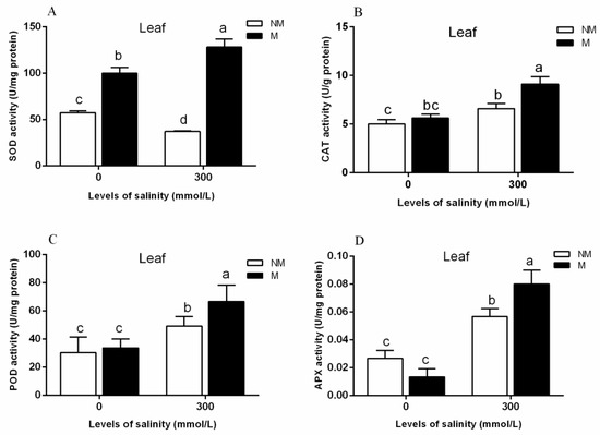 Effects of AMF inoculation on the superoxide dismutase (SOD) (A), catalase (CAT) (B), peroxidase (POD) (C), and ascorbate peroxidase (APX) (D) activities in the leaves during different salt conditions. M, mycorrhizal; NM, non-mycorrhizal; 0 mmol/L, without salt stress; 300 mmol/L, during salt stress. Columns represent the means for three plants (n = 3). Error bars show the standard error. Columns with different letters indicate significant differences between treatments at p < 0.05. Note: cited from “Arbuscular Mycorrhizal Symbiosis Modulates Antioxidant Response and Ion Distribution in Salt-Stressed Elaeagnus angustifolia Seedlings” [47].