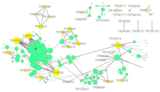 Protein—interaction network interactions for differentially expressed proteins. Note: shows the integrated network for all the differentially expressed proteins; yellow circle represents salt tolerance-related proteins induced by symbiosis and salt-induced mycorrhizal protein in this study; green circle represents other differentially expressed proteins in this study, respectively. The sizes represent the abundance of differentially expressed proteins.