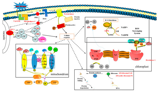 G protein, also known as signal-converting protein or coupling protein, can specifically bind and recognize signals on the cell membrane, and produce intracellular signals with the medial membrane effector enzyme (phospholipase C), which plays a role in signal transduction. After transmembrane conversion, extracellular signals are further transmitted and expanded through Ca2+ (second messenger) signals, which eventually lead to a series of physiological and biochemical reactions in cells. Ca2+ participates in metabolic pathways that are mainly dependent on changes in the Ca2+ concentration [27], and this process is achieved by the various calcium transport systems distributed in the cell organelles and cell membranes [28]. The changes in the Ca2+ concentration in the various processes in this study depended on the plasma membrane Ca2+ transporter, ATPase (PMCA), which is the main Ca2+ transporter, transporting Ca2+ to the extracellular space at the cost of hydrolyzing an ATP molecule. Studies have shown that the calcium-dependent protein kinase (CDPKs), calmodulin, calmodulin, and the calcium phosphatase B protein, are involved in cell signal transduction and responses to specific stimuli [29,30]. In this study, the Ca2+ concentrations maintained a steady state in the cell wall, mitochondria, endoplasmic reticulum, and vacuole, while the concentration in the cytoplasm was low. After salt stimulation, the Ca2+ concentration in the cytoplasm increased significantly. On the one hand, Ca2+ directly binds to the calmodulin or the calmodulin, transfers the received signal to the protein kinase and stimulates its activity, or the activity of calcium depends on the protein kinases (CDPKs), which are directly stimulated by the Ca2+ signal, and directly participate in and cause subsequent physiological responses through these two processes. These two processes directly participate in and cause subsequent physiological responses.