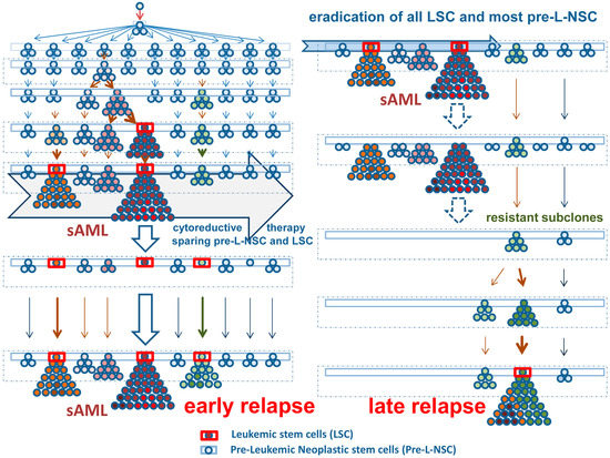 We and others have recently proposed a model of cancer evolution where the earliest stages of carcinogenesis are defined by expression of somatic mutations in small-sized (yet stem cell-containing) cell fractions [8,19,20,21,22,23,24,25]. Later, over time, one or more sub-clone(s) expand(s) and replace normal cells, depending on additional somatic lesions (Figure 1) [8]. As long as the neoplastic cells retain their full differentiation and maturation potential and can be controlled by the niche and the immune system, the involved clones will remain indolent and may, over time, replace or even mimic (at least to a degree) the normal organ in functional and morphological terms. However, as soon as the dominant clone(s) escape(s) most control mechanisms, the disease will further expand and progress into an aggressive malignancy. The end-stage of such malignancy (sAML) is usually resistant not only against most endogenous control systems, but also against diverse therapeutic maneuvers [9,10,11,12,13,14,15].