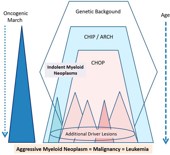Major players contributing to the ‘oncogenic march’ in myeloid neoplasms. The genetic background may form the basis of a familiar predisposition to the development of hematopoietic (and thus also myeloid) neoplasms. In some of these families, more or less specific of even disease-related mutations (with low or even high oncogenic potential) are found. CHIP develops later during lifetime—the related somatic mutations per se (as isolated lesions) have a low oncogenic potential and are more frequently detectable at higher age. Therefore, these lesions are also called age-related clonal hematopoiesis (ARCH). Later, somatic mutations with CHOP may be acquired and usually lead to an overt myeloid neoplasm (at least after some time). This neoplasm may manifest as an indolent (chronic) myeloid neoplasm unless additional drivers (driver lesions) and other oncogenic hits (loss of tumor suppressors) are acquired. In a few cases, such additional driver lesions may be acquired in a CHIP status (blue triangle) or even a pre-CHIP status and may then lead to the immediate formation of primary (de novo) AML.