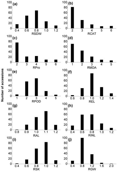 Frequency distribution of the relative value of different traits of Tibetan wild barley plants under drought treatment in pot experiment. Relative value of a given parameter was calculated as parameters under drought stress relative to control conditions (i.e., relative value = (parameter under drought stress)/(parameter under control)). (a) RSDW, relative shoot dry weight; (b) RCAT, relative catalase (CAT) activity in leaf; (c) RPro, relative soluble protein content in leaf; (d) RMDA: relative malondialdehyde (MDA) content in leaf; (e) RPOD, relative peroxidase (POD) activity in leaf; (f) REL: relative ear length; (g) RAL: relative awn length; (h) RINL: relative internode length below spike; (i) RSK, relative K concentration in shoots;(j) RGW: relative grain weight per spike.
