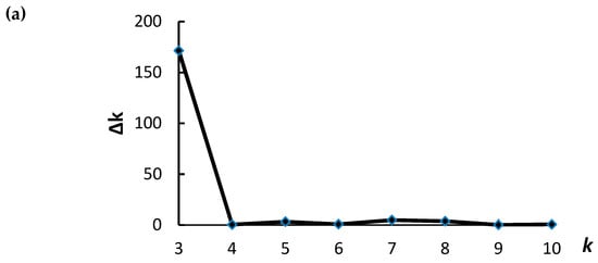 Genetic diversity was analyzed in the 166 wild barley accessions using 777 DArT markers [] with only a minor allele frequency >0.03. The genetic polymorphism, which was determined using the 777 DArT markers, was used to assess any population structure using the STRUCTURE program (v. 2.3.3, http://pritch.bsd.uchicago.edu/structure.html, accessed on 14th October 2016) [] in an admixture model, setting clusters (k) from 1 to 15 and performing ten independent runs of 100,000 Markov Chain Monte Carlo iterations. The largest value of statistic Δk indicated the number of clusters (k) [].
