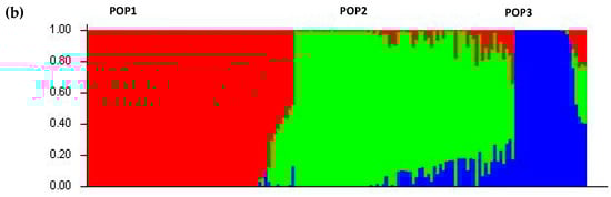 (a) The distribution of Δk, indicating the most appropriate cluster number (k) is three; (b) Population structure of 166 Tibetan wild barley genotypes at k = 3 based on genetic diversity detected by 777 DArT markers.