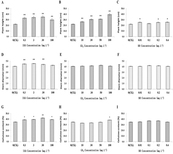 Effects of exogenously applied indole-3-acetic acid (IAA), gibberellin (GA3) and brassinosteroid (BR) on plant growth and cellulose synthesis: plant height (A–C), stem diameter (D–F) and cellulose content (G–I). * and ** indicate significant differences at p < 0.05 and p < 0.01.