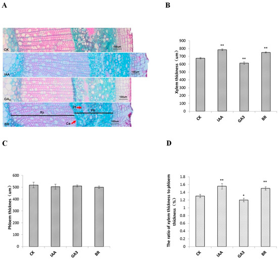 To further understand the potential function of phytohormones during secondary growth of woody plants, stems of control and experimental seedlings treated with IAA, GA3, and BR were measured to determine anatomical characteristics (Figure 2A). Xylem thickness improved significantly in IAA- and BR-treated seedlings, due to the enlargement of intercellular spaces (Figure 2B), while no significant differences were seen for phloem (Figure 2C). Meanwhile, xylem and phloem developed significantly slower in GA3-treated seedlings than in controls (p < 0.01). The ratio of xylem thickness to phloem thickness was also calculated, respectively (Figure 2D) and ratios of 1.56 and 1.50, respectively, for IAA- and BR-treated seedlings were observed that were significantly higher than the control ratio. However, a significant decrease in ratio was observed for GA3 treatment compared to control (p < 0.05).