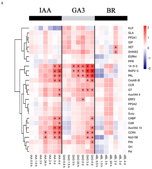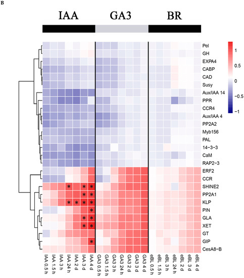 In stems, most genes showed similar expression patterns under IAA and GA3 treatments (Figure 3A). Nine of these genes were significantly up-regulated in response to either IAA or GA3, including 14-3-3, RAP2-3, PAL, CesA8-B, GT, CABP, Aux/IAA 14, CCR4 and Myb156. Aux/IAA 4 and CaM were significantly up-regulated only under IAA treatment, while ERF2 and PIN were significantly up-regulated only under GA3 treatment. Under BR treatment, only XET and SHINE2 were significantly up-regulated.