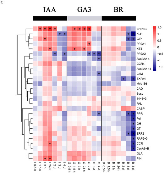 Hierarchical clustering of gene expression by qPCR under IAA, GA3, and BR treatments. Treatment times are indicated at the bottom of the figure. The samples were harvested at time points of 0.5 h, 1.5 h, 3 h, 24 h, 2 d, 3 d and 4 d. (A) Stem, (B) Root, (C) Leaf. * indicates significant differences in comparison with control (|log2f°ld change| > 1 and p < 0.05).