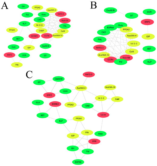 Correlation network of genes in response to phytohormones. (A) IAA, (B) GA3, (C) BR. Each node represents a cell wall biosynthesis-related gene (green), a transcription factor (red) or a signal transduction-related gene (yellow).