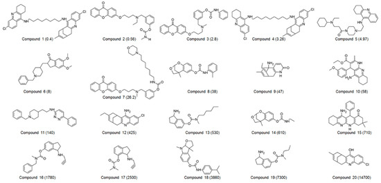 - Camps, P.; El Achab, R.; Morral, J.; Muñoz-Torrero, D.; Badia, A.; Baños, J.E.; Vivas, N.M.; Barril, X.; Orozco, M.; Luque, F.J. New tacrine− huperzine A hybrids (huprines): Highly potent tight-binding acetylcholinesterase inhibitors of interest for the treatment of Alzheimer’s disease. J. Med. Chem. 2000, 43, 4657–4666. [Google Scholar] [CrossRef] [PubMed]