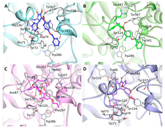 | 4 | Hit 4 | H50—Tyr72:O (2.02); O20—Asp74:H (2.72); H41—Trp86:O (2.97); H46—Trp86:O (2.94); O23—Tyr124:HH (2.41); H44—Tyr124:OH (2.99); N10—Ser125:HG (1.94); O11—Tyr133:HH (2.85); 17—Tyr337:HH (2.92); O14—Gly448:HA1 (2.84) | Trp86, Tyr337 | Val73, Tyr124, Tyr341 | Gln71, Gly82, Thr83, Asn87, Pro88, Gly120, Gly121, Gly122, Gly126, Leu130, Ser203, Phe297, Phe338, Trp439, His447 |