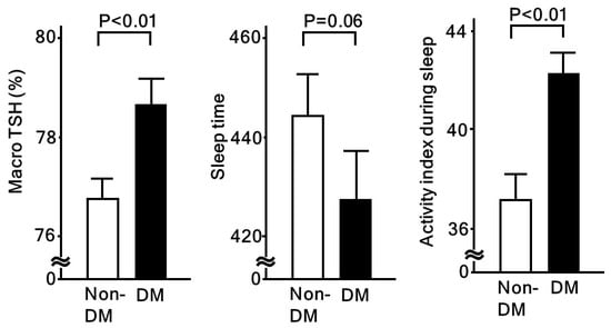 Macro-TSH and sleep quality assessed by actinography in patients with and without diabetes. Macro-TSH is significantly associated with low sleep quality []. When compared between non-diabetic (non-DM) and diabetic (DM) patients, all macro-TSH and activity index during sleep (high values represent poor sleep quality) were significantly higher in DM patients. Values shown in each column represent the mean ± standard error. Student’s t-test was used for analyses.