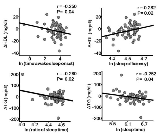 Sleep quality assessed by actigraphy is significantly associated with annual changes of high density lipoprotein (HDL) cholesterol and triglyceride level. The parameters of sleep quality were natural logarithm-transformed (ln) to achieve a normal distribution. r: Pearson’s correlation coefficient.