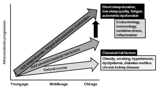 Classical cardiovascular risk factors, including obesity, hypertension, dyslipidemia, diabetes mellitus, and chronic kidney disease (CKD), are established predictors of atherosclerosis and cardiovascular disease (CVD) [,,]. Recently, behavioral and psychosocial factors have been gaining increased attention in regard to development, prevention, and treatment of CVD [], with short sleep duration and low sleep quality shown to be important behavioral factors that may be involved in its occurrence []. In this context, potential mechanisms associated with short sleep duration and low sleep quality include autonomic nervous function, and a previous study showed a strong association between those in a general population []. Additionally, autonomic nervous dysfunction has also been found to be a risk factor for CVD []. Potential mechanisms related to the associations among sleep, autonomic nervous function, and progression of atherosclerosis are summarized in Figure 1. It has been shown that short sleep duration, low sleep quality, and autonomic nervous dysfunction are associated with several risk factors for atherogenesis, including endocrinological, immunological, oxidative, inflammatory, and metabolic responses, as well as endothelial dysfunction.