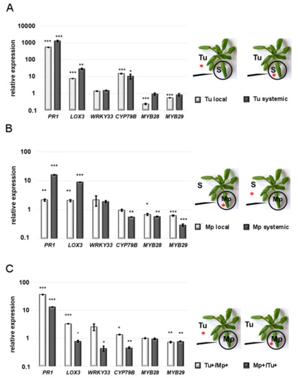 Figure 2. The comparison of defense-related gene expression in local and systemic Arabidopsis leaves upon single and simultaneous feeding of TSSM (Tu) and GPA (Mp), normalized against ACT2 mRNA level. (A) Single TSSM infestation. (B) Single GPA infestation. (C) Simultaneous TSSM and GPA infestation. S—systemic leaf. Red asterisks indicate leaves collected for gene expression assessment. Error bars represent standard deviation and black asterisks—*, ** and *** represent significant differences at p-values of <0.05, <0.01 and <0.001, respectively (n = 3). The values of the relative gene expression fold changes were listed in Supplementary material (Table S1).