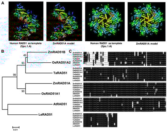 The full-length of ZmRAD51A (NP_001104918.2) coding sequence was obtained from the cDNA of maize B73 leaves by using PCR with specific primers. The ZmRAD51A transcript has 9 exons, encoding 340 amino acids (Figure S1). The predicted 3D model of ZmRAD51A showed similar structures with that of human RAD51 (Figure 1A). An unrooted phylogenetic tree generated by known RAD51 proteins exhibited a high association between ZmRAD51A and OsRAD51A1, and the two proteins share 92.46% sequence identity (Figure 1B). Amino acid sequence alignment of ZmRAD51A and other RAD51 proteins from Zea mays, Arabidopsis thaliana, Lycopersicon esculentum, Triticum aestivum and Oryza sativa Japonica suggested conservation of RAD51 across the species (Figure 1C).