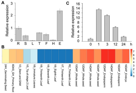 Total RNA from maize, rice, and Arabidopsis tissues was extracted by TRIzol (Thermo Fisher Scientific, Waltham, MA, USA). The reverse transcription kit (Roche Molecular Systems, Inc., Pleasanton, CA, USA) was used for cDNA synthesize. The SYBR green PCR master mix (Roche Molecular Systems, Inc., Pleasanton, CA, USA) was used for qRT-PCR reaction. The qRT-PCR was performed by Applied Biosystems 7300 (Applied Biosystems, Foster City, CA, USA) according to the manufacturer’s instruction. The qRT-PCR primers used in this study are listed in Table S1. The relative expression levels of each gene were calculated by formula 2−ΔΔCt [].