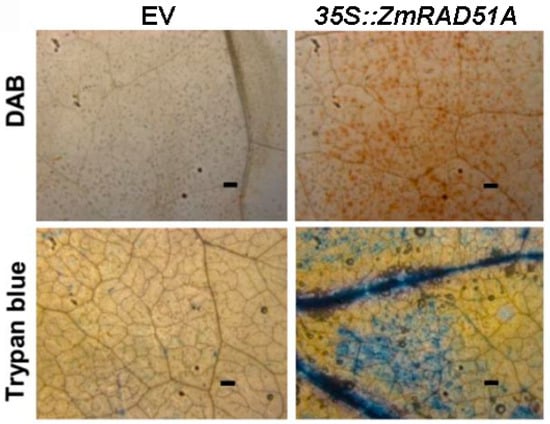 Agrobacterium tumefaciens strain GV3101 containing 35S:ZmRAD51A and pCAMBI1301 (control) constructs were respectively injected into N. benthamiana leaves by syringe, which contained the volume of about 100 μL as described by Stella et al. []. Photos of N. benthamiana leaves phenotype were taken 48 h after Agrobacterium infection. DAB and trypan blue staining were performed as previously described [,]. N. benthamiana leaves were treated with DAB (3′-Diaminobenzidine, Sigma, St. Louis, MO, USA) solution (1 mg mL−1) overnight and then cleared with 95% ethanol. For trypan blue staining, the leaves were boiled in lactophenol-trypan blue solution (1 mg mL−1) for 5 min and destained overnight in chloral hydrate (2.5 g mL−1). The DAB and trypan blue staining leaves were observed under a microscope (Leica DM5000 B, Leica Microsystems Ltd., Heerbrugg, Switzerland).