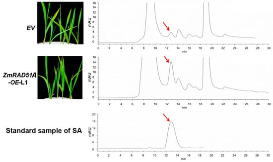 Chromatogram of SA extracted from ZmRAD51A-OE and pCAMBIA1301 transgenic rice without pathogen inoculation. The SA chromatogram from top to bottom represents pCAMBIA1301 (EV), ZmRAD51A-OE, and standard SA. The arrow indicates the SA peak; mAU indicates peak height. EV represents pCAMBIA1301.