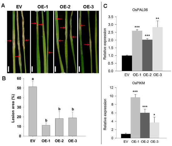 ZmRAD51A overexpression rice and control of rice plants with the fourth leaf fully expanded were selected for disease analysis. Rice seedlings were inoculated with Magnaporthe oryzae Guy 11 using the spraying method to assess the resistance of transgenic rice to blast []. Disease was scored by measuring the percent lesion area (lesion length/leaf length) at 7 days after inoculation [].