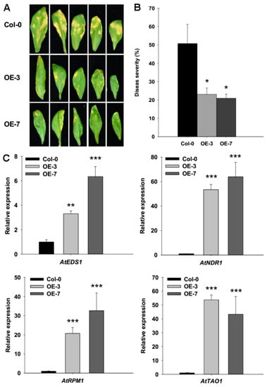 Pseudomonas syringae pv. (pathovar) tomato DC3000 (Pst DC3000) was cultured at 28 °C on King’s B (KB) medium. After 2 days, a single Pst DC3000 colony was inoculated in 5 mL KB medium for 1 day at 28 °C. One milliliter of the culture was inoculated in 100 mL KB medium for 1 day. The bacterial was harvested and suspended in a solution which included 0.01% Silwet L-77 and 10 mM MgSO4 with final OD600 = 1.0. Two transgenic Arabidopsis lines (OE-3 and OE-7) and Col-0 were sprayed with Pst DC3000 suspension. Whole Arabidopsis plants were sprayed by the bacterial suspension and then covered with plastic film for 3 days. Disease index was evaluated after 7 days post inoculation (dpi) as Niu et al. described []. Three biological replicates were set.