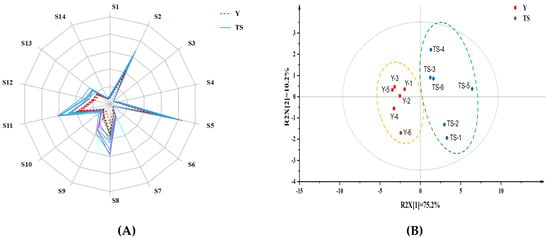 Response radar plot (A) and principal component analysis (PCA) scores plot (B) of aroma signals of CSB produced with baker’s yeast (Y) and type I sourdough (TS), respectively. S1-S14 represented 14 different individual metal oxide semiconductors (MOS) in the e-nose.