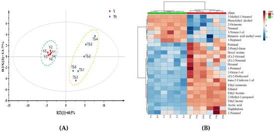 Principal component analysis (PCA) score plot (A) and heatmap analysis (B) of the headspace volatiles identified in Chinese steamed bread produced with baker’s yeast (Y) and type I sourdough (TS).