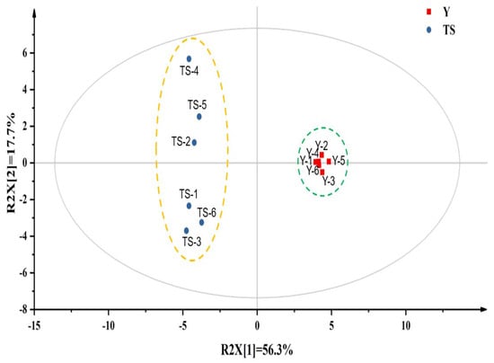 Partial least-squares-discriminant analysis (PLS-DA) scores plot of the headspace volatiles identified in Chinese steamed bread produced with baker’s yeast (Y) and type I sourdough (TS).