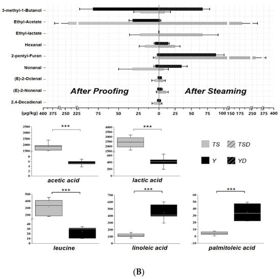 (A) Partial least-squares-discriminant analysis (PLS-DA) score plots of the potential metabolite markers in proofed dough fermented with type I sourdough (TS) and baker’s yeast (Y); (B) The concentration of characteristic volatile compounds in CSBs produced with type I sourdough and baker’s yeast and the specific precursor contents in the dough fermented with type I sourdough and baker’s yeast after proofing. All the results were performed in triplicate, and *** means p < 0.001.