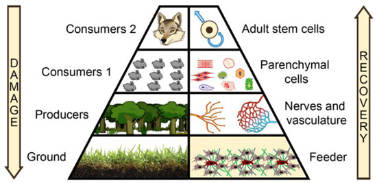 In ecological terms, this may be described as a high-order consumer entering the vast field of ashes after a forest fire before the lower levels are re-populated. Failing to find food and mate, this higher-order consumer will eventually leave the unsuitable habitat. Following this idea, the basal layer of the right side of the pyramid, the feeder (right part of Figure 1), becomes of paramount importance for microenvironment rebuilding to involve specific cell types (including stem cells), which is similar to the ecological dogma that producers’ presence is obligatory prior to appearance of consumer populations.