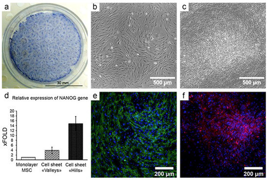 Self-organization of mesenchymal stromal cells (MSCs) in cell sheets (CS) results in the formation of a heterogeneous microenvironment. (a). Heterogeneous distribution of MSCs in CS at day 12 of culture; hematoxylin staining; b–c. Microphotographs taken in the same field of view of MSC culture at day 1 (b) and day 12 (c). Formation of a high-density “hill” is observed as a result of MSC self-organization in CS; time-lapse microscopy, phase-contrast. (d). MSC subpopulations were picked by laser microdissection. MSCs in the “hills” show increased expression of stemness-associated factor (NANOG); real-time qPCR (n = 3); data expressed as mean ± standard deviation. e–f. MSCs in CS deposit EDA-fibronectin in regular network of fibers (green, panel e) while laminin (red, panel f) is deposited primarily in “hills” but not in “valleys” creating foci of extracellular matrix deposition in CS (f); immunofluorescent microscopy, nuclei are stained by DAPI (blue); from Nimiritsky et al. [84].