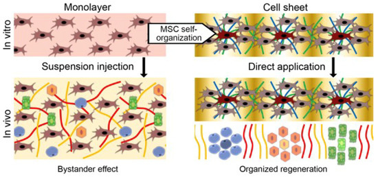 Thus, MSC therapy is limited to bystander effects similar to other stem cell therapies. However, MSCs are able to produce basic components of their own microenvironment: ECM and pro-survival soluble factors. Moreover, they are able to organize this microenvironment and generate a tissue-like structure in vitro; namely, a cell sheet (CS). The latter is generally used to facilitate cell delivery and transplant MSCs in an organized manner resolving the problem of dispersed cells’ inability to survive without an appropriate microenvironment. Below we shall provide our point of view and data that support CS-based MSC delivery as a more physiological approach, potentially providing ground for effective human regeneration.
