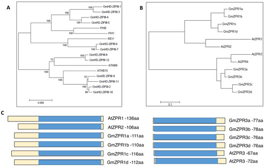 Identification of GmHD-ZIPIII and GmZPR genes in soybean. (A) Phylogenetic tree based on peptide sequence showing four major clades of soybean GmHD-ZIP III proteins, and the closest potential Arabidopsis ortholog using Neighborhood joining method. (B) Phylogenetic Tree based on peptide sequencing showing two major clades of soybean GmZPR protein and their closest potential Arabidopsis ortholog using Neighborhood joining method. (C) Protein domains of GmZPR peptides aligned with those of AtZPRs with the leucine zipper domain highlighted in blue. The length of each peptide is also indicated.