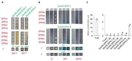 Interaction of GmZPRs with GmHD-ZIP III-1 and -2 in yeast-2-hybrid assays. (A) Colonies of mated yeast cells containing GmHD-ZIPIII-1 or -2 and one of the GmZPRs grown on SD-leu and SD-Trp. Yeast cells containing T-53 and T-Lam were used as positive and negative controls respectively. (B) Colonies of mated yeast cells containing GmHD-ZIP III-1 or -2 and one of the GmZPR3 family members grown on different assay plates imaged at 2, 5, and 10 days after plating. Q refers to minimal media without Leu, Trp, Ade and His; X- with X-α-Gal; and A-with Aureobasidin. Yeast cells containing T-53 and T-Lam were used as positive and negative controls respectively. (C) β-GAL activity of mated yeast cells containing GmHD-ZIPIII-1 or -2 and one of GmZPR3b, 3c, or 3d assayed using a spectrophotometric assay. Yeast cells containing T-53 and T-Lam were used as positive and negative controls respectively. Data shown are average Miller’s units normalized to yeast cell concentration from three replicate assays. Error bars indicate SE (n = 3). Samples marked with different letters are significantly different from each other based on One-way ANOVA and Tukey HSD test.