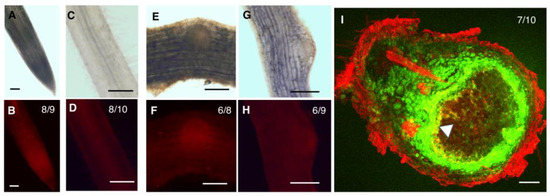 In the root tip, both GmHD-ZIP III -1 and 2 displayed expression in the meristematic region (Figure 3B and Figure 4B). While GmHD-ZIP III-1 expression was observed in the lateral root cap, GmHD-ZIP III-2 showed little or no expression in the root cap (Figure 3B and Figure 4B). Both GmHD-ZIP III -1 and 2 displayed clearly detectable expression in the root stele (Figure 3D and Figure 4D). While GmHD-ZIP III-1 expression was very low in emerging lateral roots, GmHD-ZIP III-2 had a prominent expression in these tissues (Figure 3F vs. Figure 4F). In contrast, GmHD-ZIP III-1 showed much prominent expression in emerging nodules (7–8 days post rhizobium inoculation) compared to that of GmHD-ZIP III-2 (Figure 3H vs. Figure 4H).