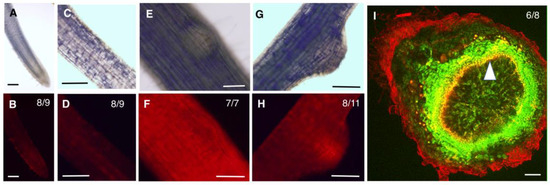 For epifluorescence microscopy to visualize promoter:tdTomato expression patterns, whole roots or root segments were mounted in 10% glycerol and imaged using AX70 upright microscope (Olympus, Shinjuku, Tokyo, Japan) using the TRITC/PI filter (exposure time: 25 ms). Images were taken at a resolution of 2040 × 1536 pixels and saved as tiff files. Mature nodules were sectioned transversally, sections were mounted in 10% glycerol, and imaged in an Olympus FV1200 scanning confocal microscope (Olympus, Shinjuku, Tokyo, Japan). The 488 nm Ar laser (8% power) and default settings for GFP in FV10-ASW software were used for GFP imaging. The 543 nm HeNe laser (8% power) and default settings for DsRed in FV10-ASW software were used for tdTomato imaging, Images were taken at a resolution of 663 × 663 pixels, and a maximum intensity projection stack of 5 slices (5 µm total depth) were exported as a tiff file for each nodule section.