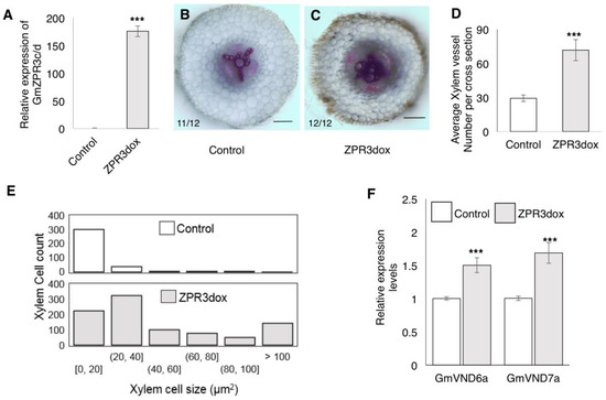 We counted the number of tracheary elements (xylem cells) and measured their area in cross section images of 12 roots each for vector control and ZPR3dox. ZPR3dox roots had ~2.5-fold higher number of xylem cells (Figure 6D) compared to vector control roots. We also observed a significant increase in the average xylem cell size (cross sectional area) in ZPR3dox roots. It was evident from the pattern of xylem cell size that a large proportion of these cells in ZPR3dox roots were larger (Figure 6E). For example, ~87% of xylem cells in vector control roots were 0–20 µm2 in size. On the other hand, only ~26% of xylem cells in ZPR3dox roots were 0–20 µm2 in size with nearly 16% in the >100 µm2 range. The ectopic secondary xylem formation was reminiscent of what has been observed in arabidopsis plants with reduced levels of ATHB15 [26,27,28] and miR166 over-expressing M. truncatula roots [18]. This indicated that the observed phenotypes are likely to be due to impaired HD-ZIP III function, in particular that of GmHD-ZIP III-2 (a potential ortholog of ATHB15) resulting from over-expression of GmZPR3d.
