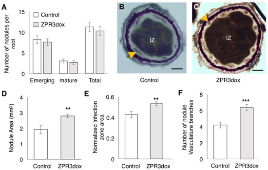 To evaluate the impact of GmZPR3d over-expression on nodule development, we inoculated composite soybean plants with B. diazoefficiens, and counted the number of nodules and evaluated their structure. Nodules were classified into emerging nodules which appeared as slight bump on the root surface, and mature nodules that were spherical in shape and had emerged out of the root. We did not observe any significant difference in the numbers of emerging or mature nodules between vector control and ZPR3dox roots (Figure 7A). We further evaluated the structure of mature nodules on ZPR3dox roots by measuring nodule size, central zone (infection zone) size, and counting the number of nodule vascular bundle branches in transverse sections of mature nodules stained with phloroglucinol (Figure 7B,C and Figure S6). GmZPR3d over-expression led to a significant increase in the nodule area (~1.5 fold) and normalized central zone (infection zone) area (~1.3 fold) compared to the vector control (Figure 7D,E). We also observed a significant increase in the number of vascular bundle branches in ZPR3dox nodules compared to control nodules (Figure 7F). This suggested that HD-ZIP III activity might be crucial for regulating nodule and central zone size as well as vascular bundle branching in the nodules.